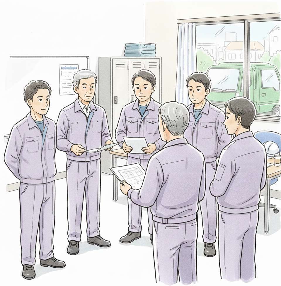 美清園の現場スタッフの一日は早朝から始まります。7時30分から朝礼が始まりますので、その5~10分前には出社します。朝礼では、各現場の進捗状況報告ならびに当日の工程や、当日の作業における安全管理について打ち合わせをします。スタッフ全員が一日の計画や作業における安全面をしっかり把握します。これが、スムーズな作業進行と事故防止の鍵となるのです。