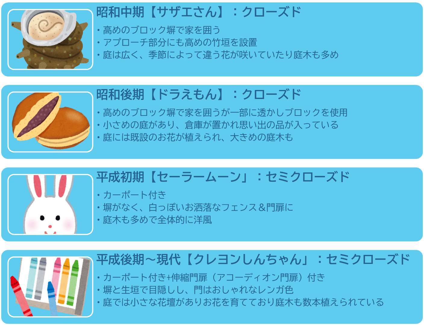 誰もが知っている国民的アニメと聞くといくつか思い当たると思いますが、実はそれぞれの家やお庭を見ることでその時代のスタンダードや流行の外構が見えてきます。